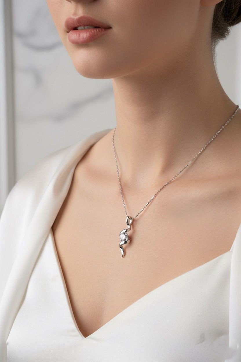 A beautifully sculpted twist-design pendant featuring a brilliant solitaire crystal, offering a perfect balance of elegance, movement, and modern sophistication.